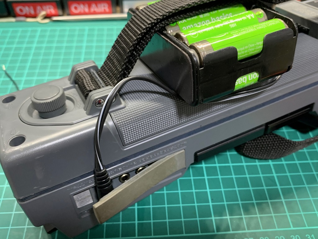 市民ラジオのトランンシバーは電源電圧が高く乾電池が多く必要なため、充電式の電池を使用しています。市民ラジオのSR-01は内部の回路で電圧を上げて一定の性能で動くようになっているのでどちらの電池でも問題ありませんが、昔の機種「ICB-770」や「ICB-87R」などはエネループ8本だと電圧不足で送信出力が下がってしまいます。1.2Vの充電池8本では500mW出ず300mW程度しか出ません、そのため10本の充電池を電池ボックスに入れて繋いで使っています。