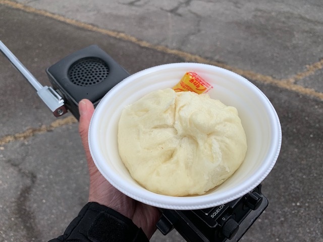寒い柏原山で蒸かした豚まんをいただき温まる