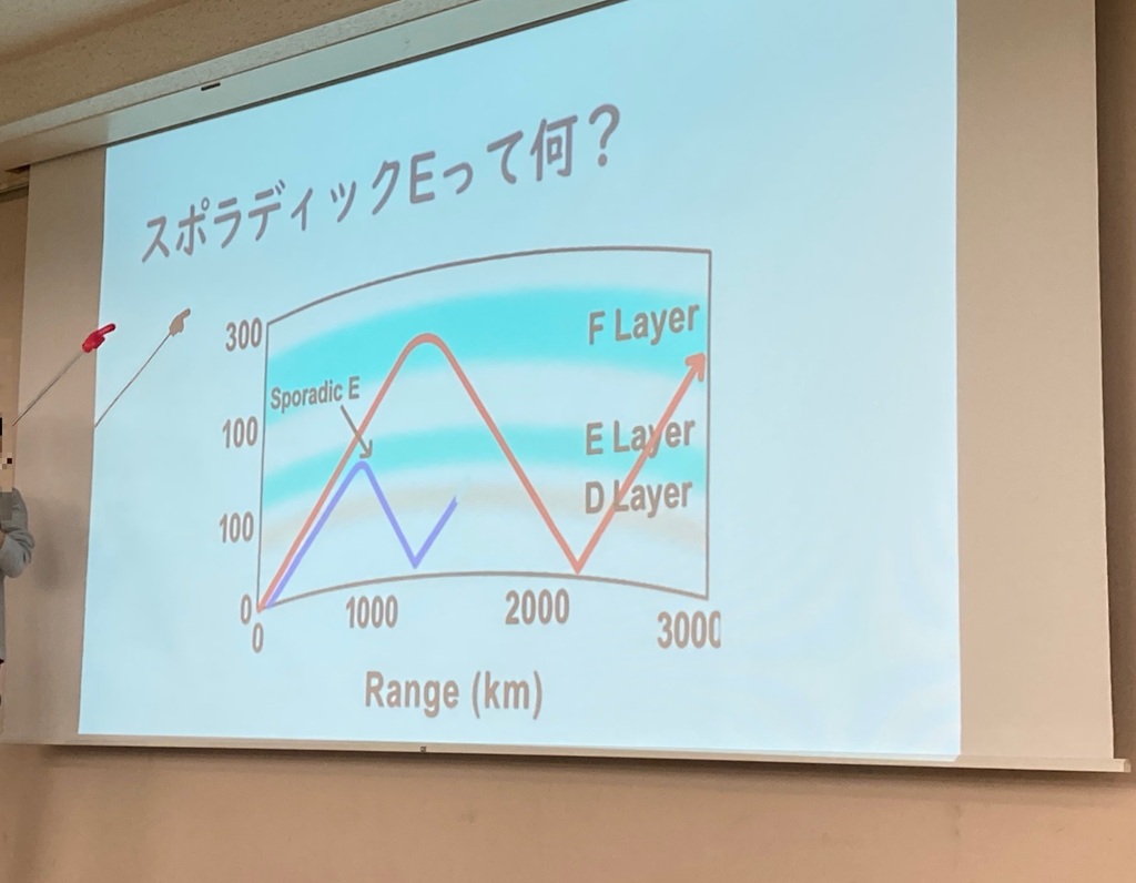 ■大学生のミエJSG530さんが「スポラディックEを科学する」と言う表題で発表してくれました。まだはっきりと発生メカニズムが解明されていない「スポラディックE層」、Eスポと呼ばれていますが100キロ前後の上空に突然現れる強力な電離層のことで短波や超短波の電波を反射します。