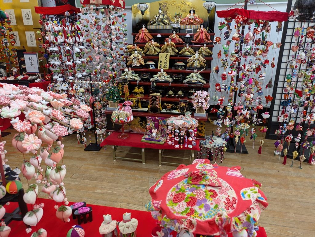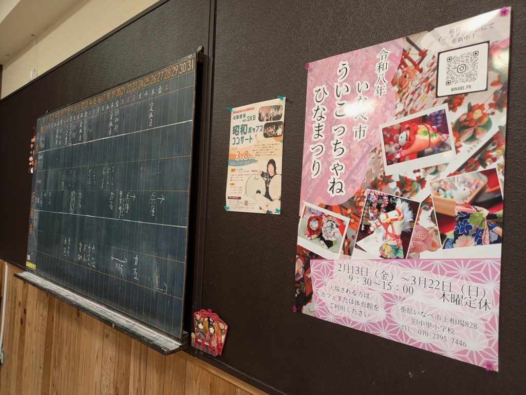 ■いなべ市藤原町の旧校舎を利用した施設「ういこっちゃね」はカフェやアクティビティが楽しめるところです。ひな祭りに合わせて吊るし雛が展示してあります。