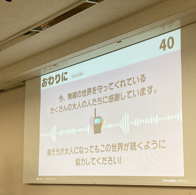 ■小学6年生の「ふくおかMK11さん」の発表「ジュニア無線家の活動 未来の無線家を増やす方法を考える」です。ふくおかOC68局さんが運用されている姿を見てかっこいい!と思い無線通信に興味を持たれたそうです。今の時代からすると珍しく彼の目には新鮮に映ったんでしょう。